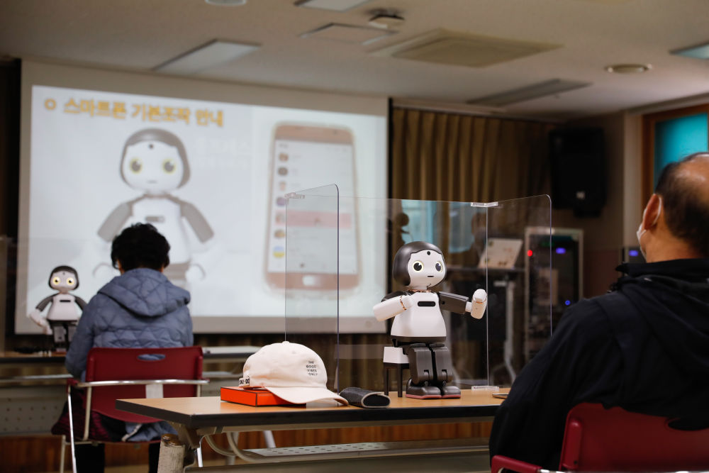 2020年11月16日,老人们在韩国首尔阳川区一处老年福利文化中心学习如何利用数码教学机器人“LIKU”掌握智能手机使用技能。新华社记者 王婧嫱 摄
